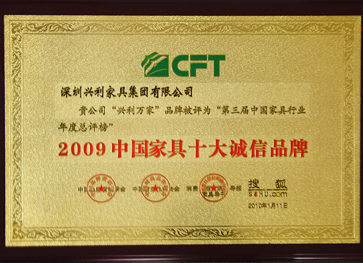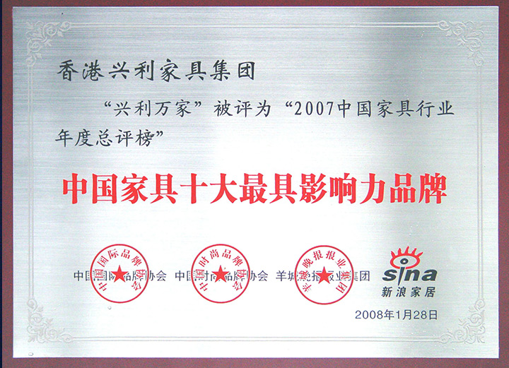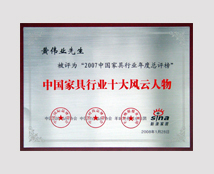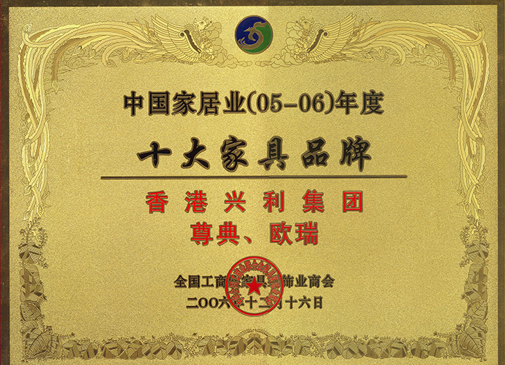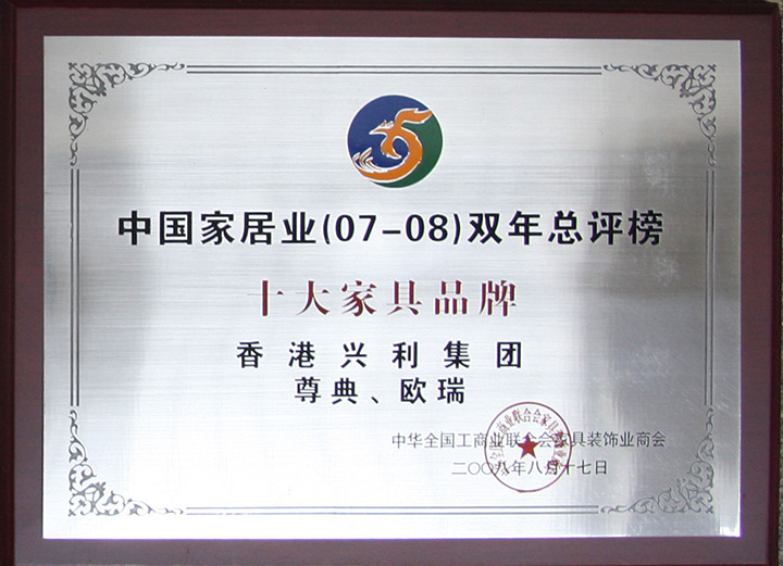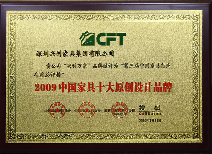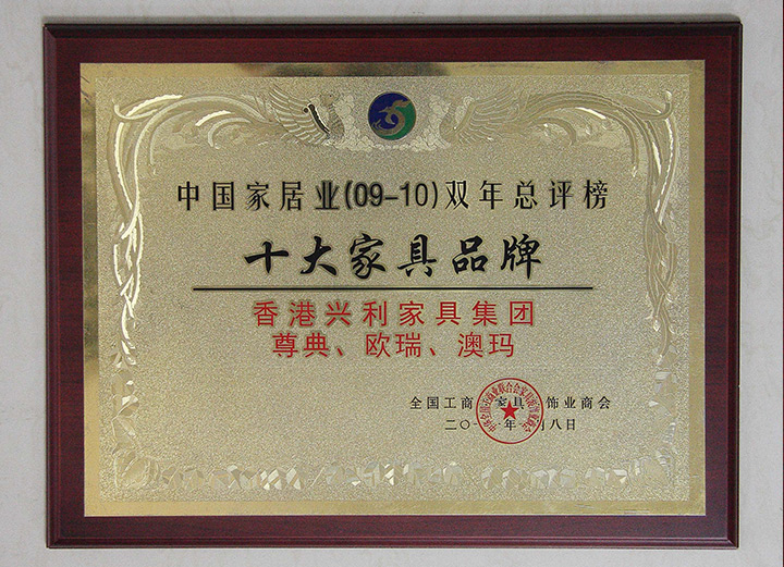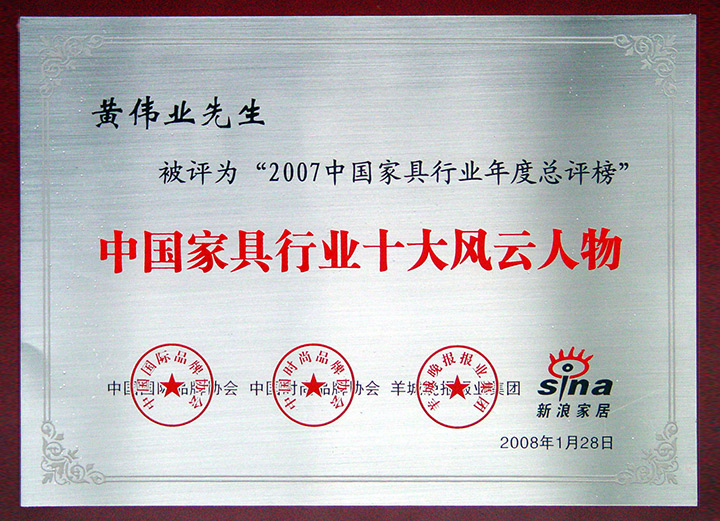 The 25th Shenzhen Furniture Fair - Environmental Quality Award / Year 2009 China Top 10 Original Design Brand Award / 2009/10 China Top 10 Integrity Brand / 2010 The 5th Top 500 Asian Brands